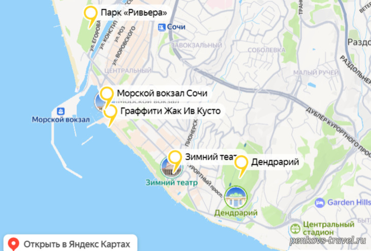 Сочи – это город контрастов, где природа и история переплетаются, создавая неповторимую атмосферу. Путешествие сюда может быть наполнено разнообразными впечатлениями, от спокойного созерцания морских просторов до исследования таинственных уголков прошлого. Заказать экскурсии в эти интересные места можно на сайтах Sputnik8 или Tripster.ru Мы поделимся с вами информацией о том, как провести время в Сочи, какие места стоит посетить и какие природные чудеса необходимо увидеть. Самые лучшие и бюджетные туры и билеты на самолет в нашем Телеграмм-канале! В XIX столетии на побережье Чёрного моря в районе современного Сочи располагались оборонительные сооружения, построенные русскими войсками. В пределах современного города были построены форты Александрия (ныне Сочи), Лазаревский, Головинский (ныне Головинка) и укрепление Святого Духа на месте Адлера. В те времена на этих землях жили люди разных национальностей: русские, украинцы, белорусы, армяне, грузины, греки, эстонцы, молдаване и многие другие. В начале XX столетия Сочи и его окрестности превращаются в место отдыха. Здесь появляются дачи, гостиницы, санатории и другие объекты туристической инфраструктуры. Также активно создаются сады и парки. На карте можно увидеть маршрут, который проходит через главные достопримечательности. Отправляйтесь в путь и исследуйте город в удобном для вас темпе! 1. Набережная и портПротяжённость Центральной набережной Сочи составляет два километра. Она представляет собой пешеходную улицу, расположенную вдоль побережья Чёрного моря. Набережная начинается от морского вокзала и заканчивается у проспекта Пушкина. Здание морского вокзала было возведено в 1955 году. Это двухэтажное сооружение, выполненное в стиле, типичном для сталинской архитектуры, отличается своей монументальностью и величием. Над центральной частью здания возвышается башня, увенчанная шпилем высотой 38 метров. На шпиле находится орден Отечественной войны. В здании вокзала есть магазины, кафе, рестораны и зона ожидания. Интерьеры выполнены с использованием мрамора, ценных пород дерева, бронзы и орнаментальной лепнины. Стены украшены изображениями счастливого будущего в советском стиле. Также стоит отметить цветные мозаичные полы, массивные люстры и литые чугунные детали. По обе стороны от здания вокзала расположены внутренние дворики с галереями, украшенными фонтанами, чаши которых имеют форму морских раковин. В одном из двориков установлена статуя девочки, а в другом — мальчика. Вблизи железнодорожной станции находится ещё один фонтан. Его украшением служит скульптура женщины, которая олицетворяет покровительницу моряков — Навигацию. В непосредственной близости от фонтана установлены фигуры героев известной кинокартины «Бриллиантовая рука». Одним из самых ярких способов насладиться красотой Сочи является прогулка на яхте по Черному морю. С борта открываются захватывающие виды на побережье, горы и бескрайний горизонт. Морской бриз, шум волн и крики чаек создают ощущение свободы и умиротворения. В ясные дни можно отправиться в морское путешествие на яхте, наслаждаясь видами побережья или же отплыть подальше, чтобы искупаться в открытом море. Капитаны яхт всегда готовы предложить свои услуги. Стоимость часовой прогулки на яхте составляет примерно 1500 рублей. На улице Несербс